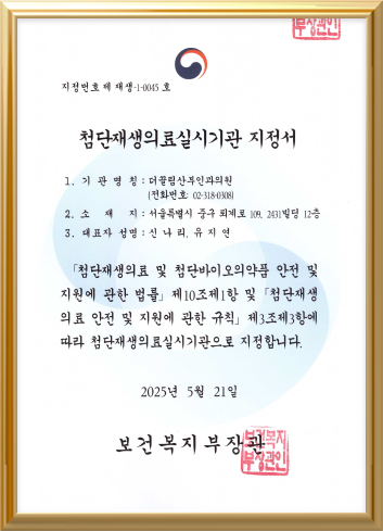 더끌림은 보건복지부의 엄격한 심사를 통과해 줄기세포 및 유전자 등을 활용해재생의료 연구가 가능한 첨단재생의료실시기관으로 지정되었습니다.