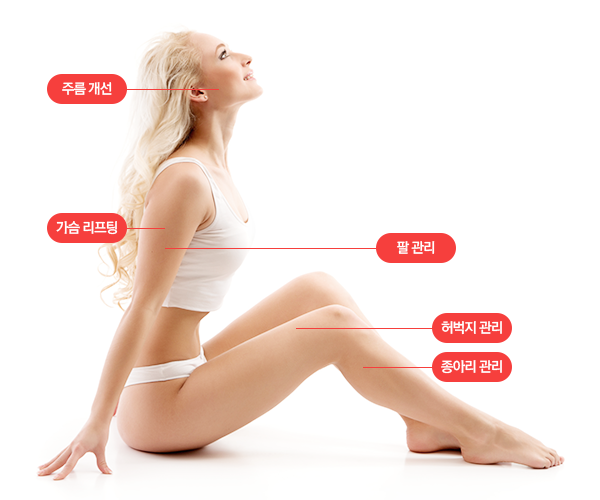 전신 체형 관리, 지방흡입 수술 전/후 관리, 얼굴 관리(안면주름, 리프팅효과), 복부관리, 여드름 기미관리, 가슴 리프팅 관리, 다크서클관리, 팔뚝, 허벅지, 종아리 관리 등 다양한 시술과 폭넓은 부위를 관리할 수 있습니다.