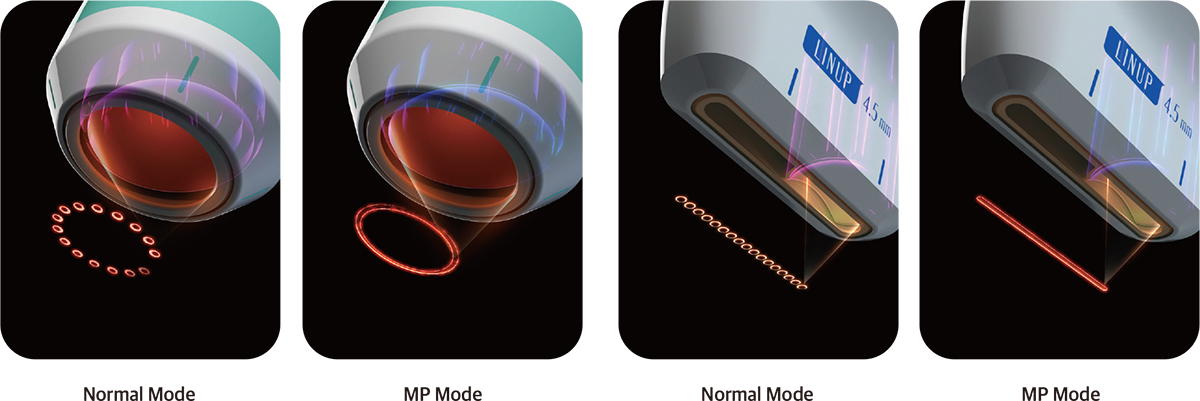 MPT(Micro Pulsed Technology) 기술을 탑재하여 MP와 Normal(Dot) 2가지 모드를 선택할 수 있습니다. 개개인의 피부상태와 부위에 따라서 보다 정교하게 시술할 수 있습니다.