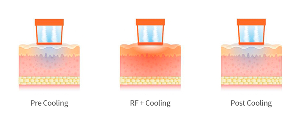 컨텍 가스 쿨링 시스템과 진동 기술로 통증을 줄여 피부 표피는 보호하고 피부 깊은 곳까지 RF 에너지를 전달합니다.